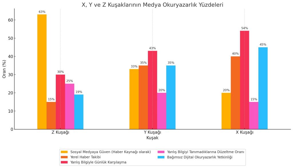 Y kuşağı, %33’lük sosyal medyaya güven oranıyla Z kuşağından daha temkinli ama hala oldukça savunmasız. Yanlış bilgiyle günlük karşılaşma oranı %43 ve buna karşılık düzeltme yapma oranı sadece %20. Bu kuşağın dijital okuryazarlığı Z’ye göre biraz daha yüksek olsa da (%35), sorgulama refleksi hala zayıf diyebiliriz.