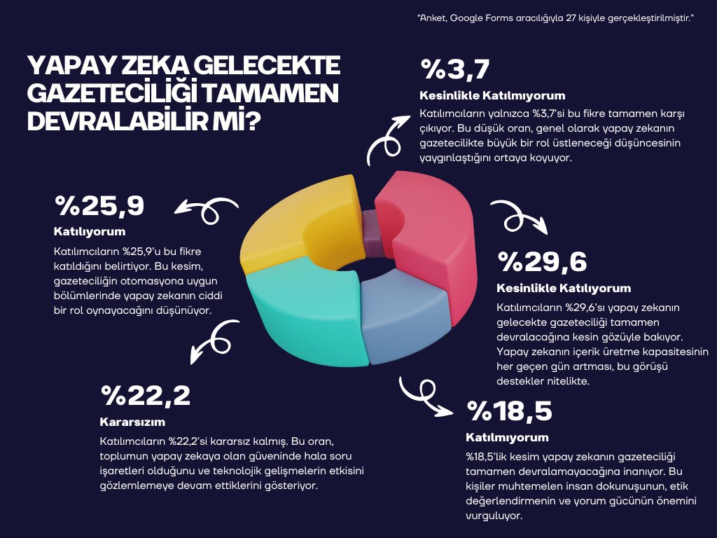 Diğer yandan, %18,5’lik bir grup bu görüşe katılmadığını ifade ederek, gazeteciliğin insana özgü yorumlama gücüne ve etik değerlerine vurgu yaptı. Kesinlikle katılmıyorum diyen %3,7’lik kesim ise yapay zekanın gazeteciliğin özünü asla tam anlamıyla kavrayamayacağını düşünüyor.